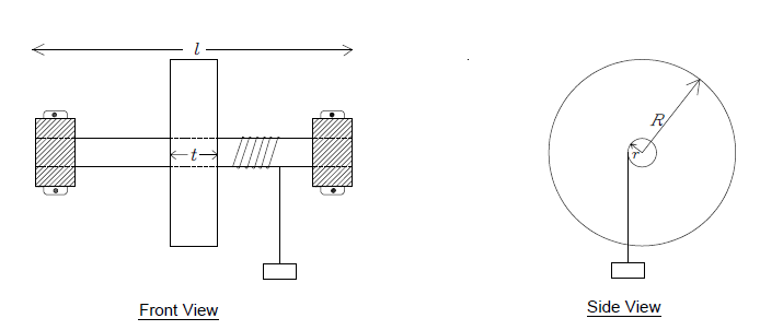The flywheel in this experiment is a solid disc of mass $M_{1}$ and radius $R$ attached to a shaft of mass $M_{2}$ and radius $r$. The moment of inertia of the flywheel system is given as: